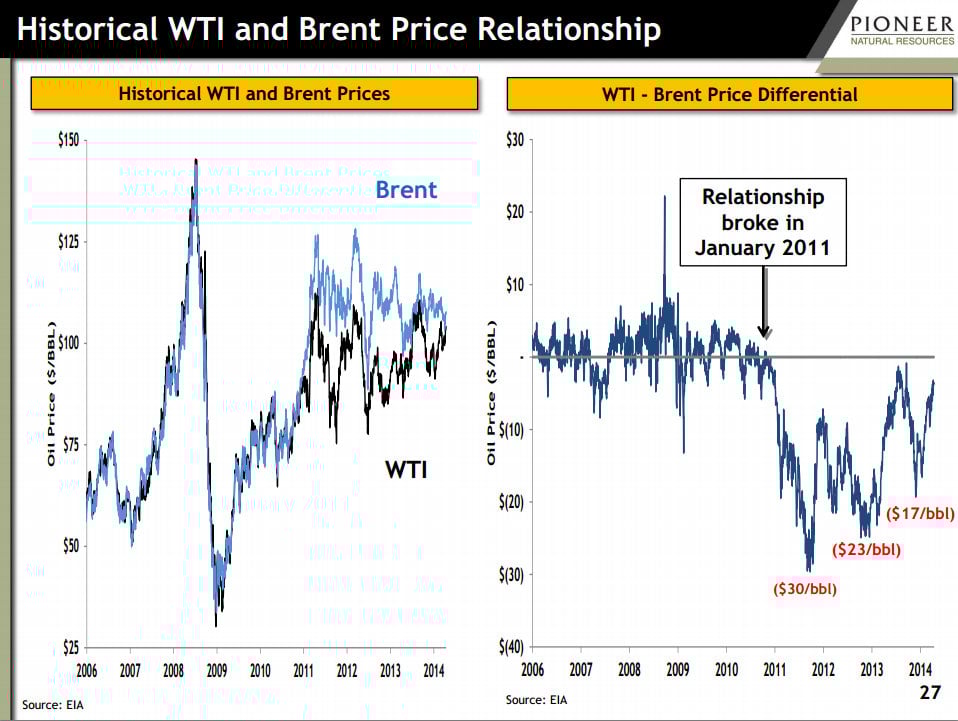 Up until just a few years ago domestically produced oil, which is benchmark priced to West Texas Intermediate or WTI, had traded on par with the globally benchmarked Brent crude price. But that relationship broke in January 2011 and as the following slide from a recent investor presentation by Pioneer Natural Resources (PXD +0.00%) points out, the discount has been fairly steep at times.