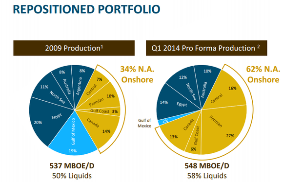 All in all, North American onshore production accounted for 62% of Apache's pro forma net production during the first quarter of this year, up from only 34% during 2009, as shown in the chart below.