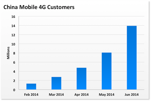 China Mobile just posted a massive jump in 4G customers in June. The carrier now has nearly 14 million 4G customers, up from 8.1 million in May. If the iPhone continues to comprise about half of those customers, then there could be some upside to the iPhone figures that Apple is about to report.