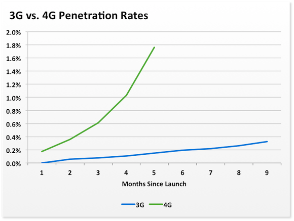 China Mobile customers have been jumping on the 4G bandwagon much faster than they did when 3G was introduced. 4G penetration of China Mobile's 790 million customers is already approaching 2%.