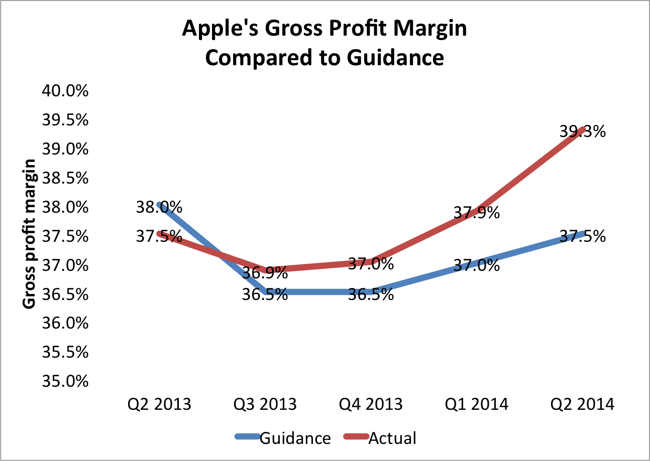 Going into Apple's fiscal third-quarter earnings report, Apple has guided for another year-over-year gain for its gross profit margin. Apple expects gross margin to come in somewhere between 37% and 38%. Last year, Apple recorded a gross profit margin of 36.9%. Notably, however, Apple has beaten its guidance midpoint for gross profit margin by 40 basis points or more in the past four quarters in a row. To top it off, Apple has been beating its gross profit margin guidance more considerably in the past two quarters.