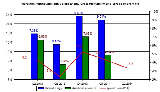 But perhaps the ongoing fall in the spread between Brent and West Texas Intermediate crude oil, which could adversely affect its profit margin, is also dragging down Valero Energy's valuation.
