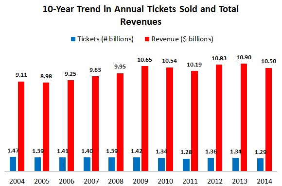 Number of tickets sold fell 11% between 2004 and 2013 while revenues rose 17%. 2014 data is annualized. Credit: The-Numbers
