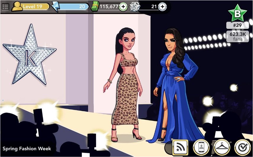 The goal of Kim Kardashian: Hollywood is to become an A-list celebrity. To accomplish this, Kim advises players to buy better clothes and date famous people to boost their social ranking. To achieve that, players need to spend virtual dollars known as "K-Stars" in the game. A player can buy up to 175,000 K-Stars at a time for $99.99. Just like other "pay or wait" games, players who don't want to pay real money must spend energy on jobs or wait for hours to earn more K-Stars.