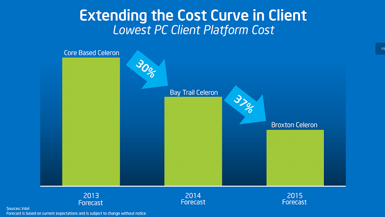 This appears to be an admission that AMD doesn't have the cost structure to defend itself against Intel's 22-nanometer Bay Trail parts in the low-cost PC market. Given that Intel is projecting that costs for its next-generation 14-nanometer Celeron/Pentium products due in 2015 will be lower than this year's Bay Trail-M/D, and given that the cost per transistor at the 20-nanometer foundry nodes (which AMD will be beholden to) go up, it's difficult to see AMD improving its competitive positioning here.