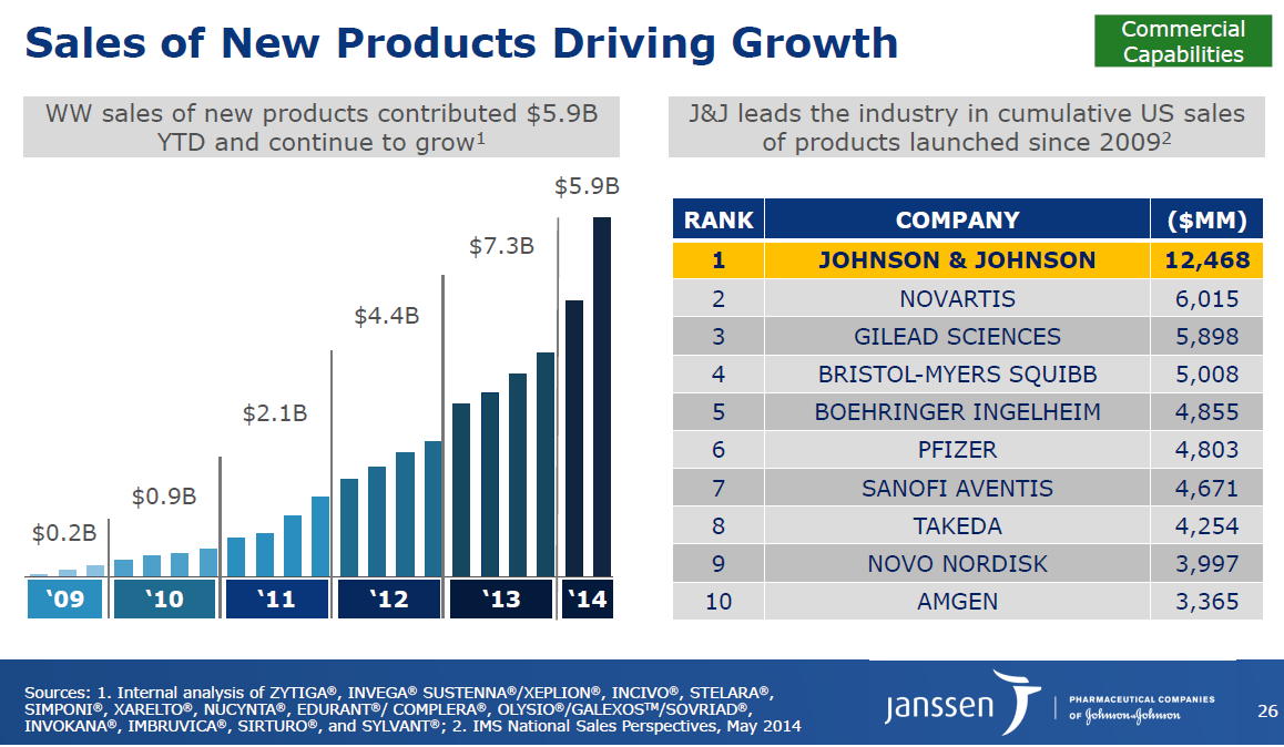 Let's take a step back and look at the big picture for JNJ. After all this pharmaceutical and consumer product behemoth is far from a one-trick pony. The company's pharmaceutical segment shows especially promising prospects due to strong showings in immunology, oncology and infectious diseases drugs. You can see a better view of the company's big picture from the following graphic of JNJ's pharmaceutical division Janssen, showing the market leading strength in new product launches and the impressive resultant revenue growth:
