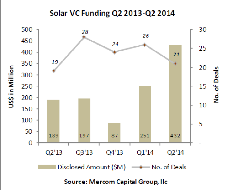 Overall, total global corporate funding in the solar energy sector -- VC, PE, debt financing, and public market financing by publicly listed companies -- totaled $6.3 billion in 2Q 2014 as compared to $7 billion in Q1, the market research company reports in its "Solar Q2 Funding and M&A Report."