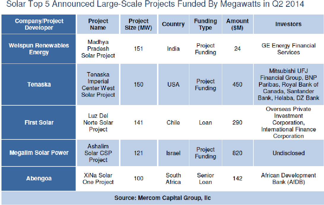 Turning to solar project financing, Mercom recorded 33 large-scale deals totaling $3.5 billion during Q2. The largest was $820 million for Megalim Solar Power's 121 megawatt (MW) concentrating solar power (CSP) project in Israel.