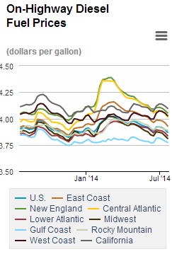 Diesel prices followed gasoline's lead with a $0.025 dip over the past week to $3.869 per gallon. This latest price tag puts diesel $0.034 per gallon below its price the same time last year. East Coast prices fell the most ($0.033), while Rocky Mountain residents missed out again with a relatively minor $0.007 decline.