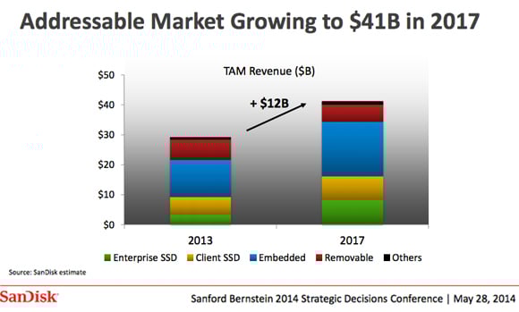 Finally, the acquisition of Fusion-io is likely going to be a long-term positive for SanDisk, as it will increase the company's exposure to the SSD market by bringing in 7,000 worldwide customers. SanDisk will also get access to Fusion-io's SSD production capabilities. Fusion-io shipped 531,000 SSD peripheral devices last year.