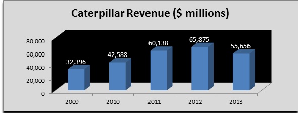 Caterpillar's revenue rose substantially year over year from 2009 until 2012, but in the last year the revenue plunged due to the slump in the mining industry. The decline affected revenue from Caterpillar's resource industries segment (which caters to mining), as sales of high margin mining equipment took a severe hit. However, the consistent performance of the construction and power segments in 2013 averted the dramatic revenue slide.