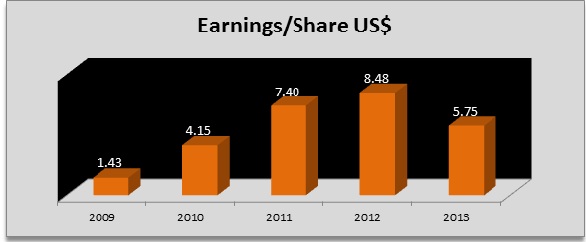 Caterpillar has been a stable dividend yielding stock and its quarterly dividend has increased gradually from $0.0875 per share in 1996 to $0.60 per share by 2013. In this fiscal first quarter the company has declared a dividend payout of $0.60 per share which convinced investors perturbed with the dwindling mining industry prospects. The company has also maintained regular dividend payout on an annual basis over the past years. The company has also announced an interim dividend in June this year which is a 17% hike to 0.70 per share.