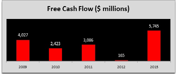 While Caterpillar has consistently generated free cash, the company has experienced major swings year to year. True, the company has been able to generate positive cash flow every year for the past five years, however small, even in 2012 when the company's poor inventory management ate away at free cash flow generation.