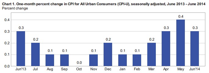 According to the report, it was gasoline's 3.3% month-to-month price rise that was responsible for approximately two-thirds of June's index increase. Food costs edged up just 0.1%, the smallest gain since January. The 3.3% jump in gasoline costs was not expected to be repeated in July given that pump prices have been falling in recent weeks. Food costs have been rising sharply this year, reflecting a variety of factors from cold weather hurting winter crops in such states as Florida and a severe drought in California.