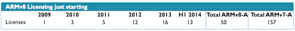 ARMv8 licensing activity has dramatically accelerated over the past 18 months, and the company now has 50 total licenses. Apple took the industry off guard when it announced A7 last year, and competitors have scrambled to catch up in the 64-bit race. In December, a Qualcomm (QCOM +0.46%) employee conceded that the A7 "hit us in the gut" and that the company was "stunned" and "unprepared."