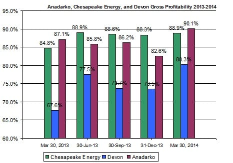 Nonetheless, the high oil and natural gas prices will benefit other oil and gas producers such as Devon Energy (DVN 0.32%) and Chesapeake Energy (CHK +0.00%), as indicated in the chart below. All of the above mentioned companies improved their profit margins in the past quarter.