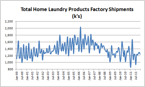 First, white-goods manufacturers such as Whirlpool look set to benefit from the 10-year anniversary of the U.S. housing boom. Note in the following chart how home laundry product shipments peaked in 2005-2006 -- if home goods tend to depreciate over 10 years, then companies such as Whirlpool can expect to see a replacement cycle to kick in.