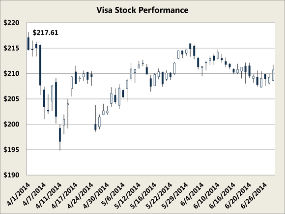 And through the first six months of its 2014 fiscal year -- the year concludes for Visa on September 30 -- Visa repurchased $2.2 billion worth of its common stock at an average price of $208 per share. And during the first three months of the year its $1.1 billion in repurchases cost the company $217 a share.