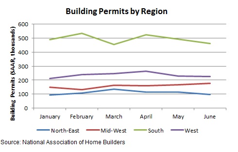 Job and income growth have been relatively strong in the South, especially given the strength in oil production and exports. Population growth has increased in the region's largest metropolitan areas, especially in Texas, Georgia, and the Carolinas. Excluding the South, new starts actually increased 14.6% in June with an increase of 28% in the Midwest. Even with the possibly erroneous data in June, starts are higher by 7.4% and permits are higher by 2.7% against the same month last year.