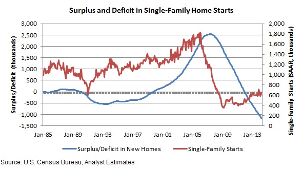 There is also good evidence for long-term support for the housing market. Despite a rebound in sales of existing homes, new home starts have never really recovered to the long-term average. According to data from the U.S. Census, single-family housing starts averaged 1.1 million a year in the decade leading up to 2000 but have averaged just 515,000 a year over the last five years. Using data on home starts back to 1985, I have constructed the chart below. If we assume that natural demand is for about 1.1 million new homes a year, the market has transitioned from a surplus of 2.5 million homes at the peak of the boom to a current deficit of 1.2 million homes.
