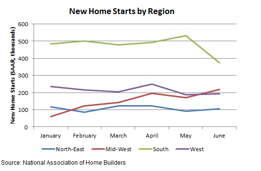 While the trend in new starts was not strongly positive, nothing pointed to such a volatile drop. In fact, new starts in the southern region had not varied by more than 8% in any month this year. New homes in the South dropped from being 54% of the total in May to just 42% in June. While the percentage of new construction in the region as a percentage of nationwide starts has varied, as high as 54% in February and May to as low as 46% in April, you would not expect such a drastic change in the region's relative importance.