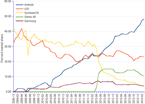 People are starting to realize that Google's Android is a buggy, malware-filled, and confusing operating system that can't even run Google Maps as smoothly as an iPhone. However, people put up with it for big screens and Android's market share grew immensely as seen in the chart below. If you view the chart after May of 2012, when the Galaxy S3 was released, you can see the chart steadily spike upwards at an extreme rate. The Galaxy S3 sold over 30 million units by the end of the year. While this isn't amazing, it really drove the Android platform and helped it compete with iPhone.