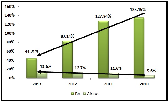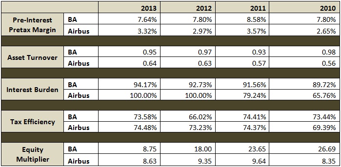 In contrast, the low ROE for Airbus comes from its lower pre-tax pre-interest margin as well as lower asset turnover ratio. The reason for this can be found in the history and past strategies of the company. Airbus was formed out of the national aviation companies of France, Germany, Britain, and Spain and went public in 2000. Over the past 13 years, the company more than doubled its sales, but profits stagnated. Airbus' profitability remained constrained by its overbearing work culture and its policy of undercutting prices to drive volumes, something that the company is trying hard to overcome.