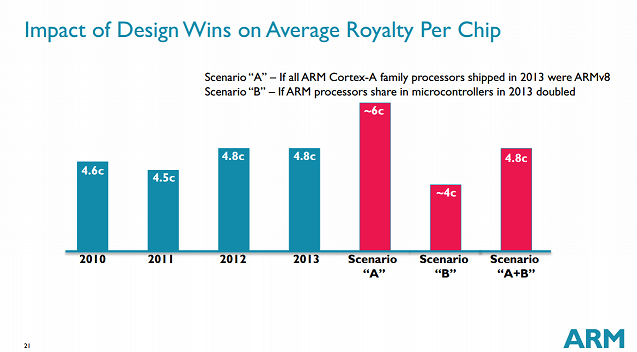 In its prepared slide deck, ARM gave some indications of how the transition to processor designs utilizing the company's ARMv8 architecture – ARM's 64-bit instruction set architecture – affects the royalty rate. Observe the following slide: