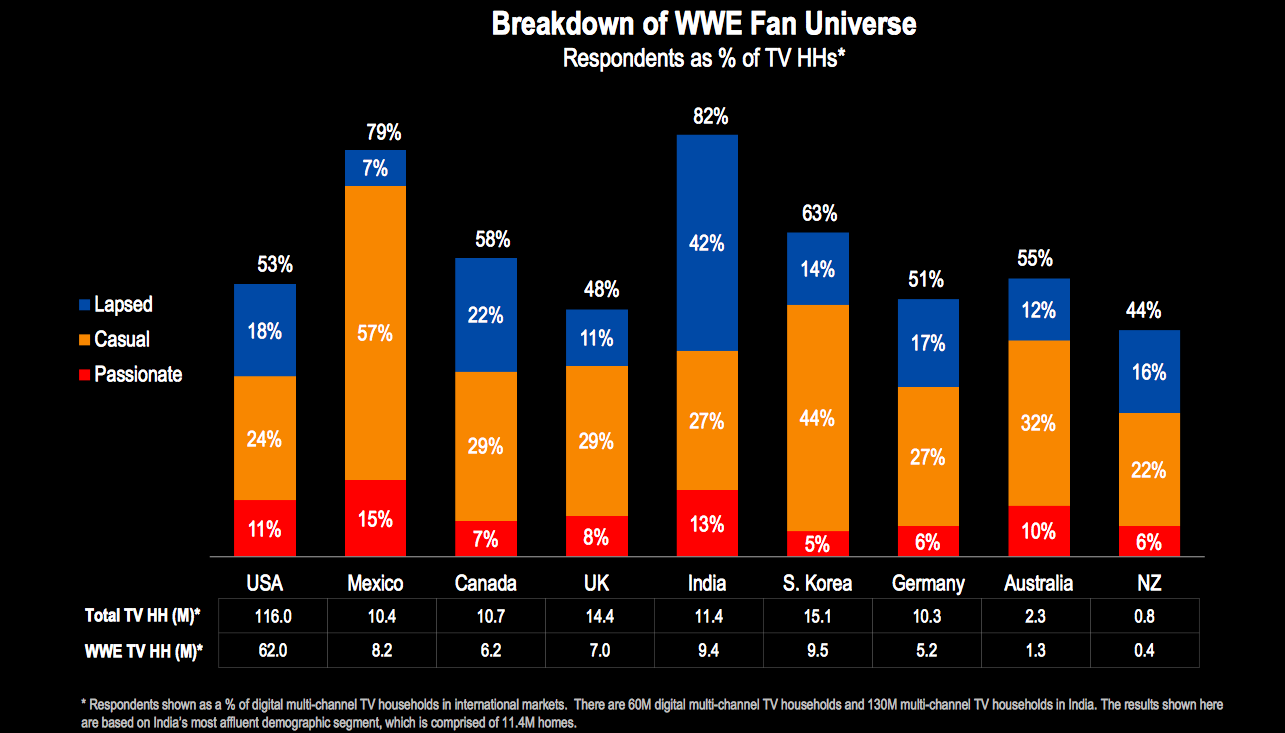 Of the 116 million TV-viewing households in the U.S., WWE thinks it can count on 13 million being passionate fans, so it's looking for 10% of them to bring it back to where it was in terms of revenue within the next year. That's an attainable goal, but a company can't just be complacent; it needs to grow. The U.S. is its largest market by far, but Mexico actually has a larger "passionate" fan base, a significantly greater "casual" fan cohort, and the smallest "lapsed" fan count than any other market anywhere, according to the chart above. In fact, most of its other international markets have bigger casual fan bases of the sport than does the U.S., so opening the network to global subscribers will allow it to expand its growth exponentially.