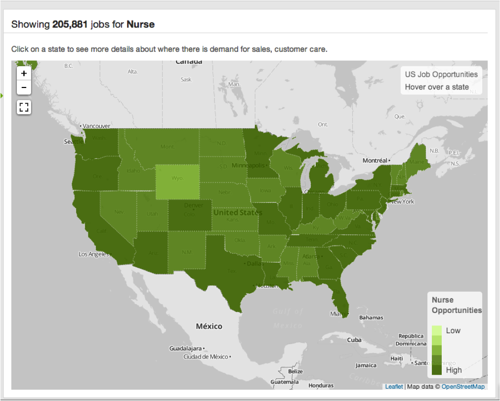 From there, a click on any state reveals county-by-county data so job seekers can pinpoint their search to the areas with the most opportunities. A click on a county shows the relevant job openings in that area.