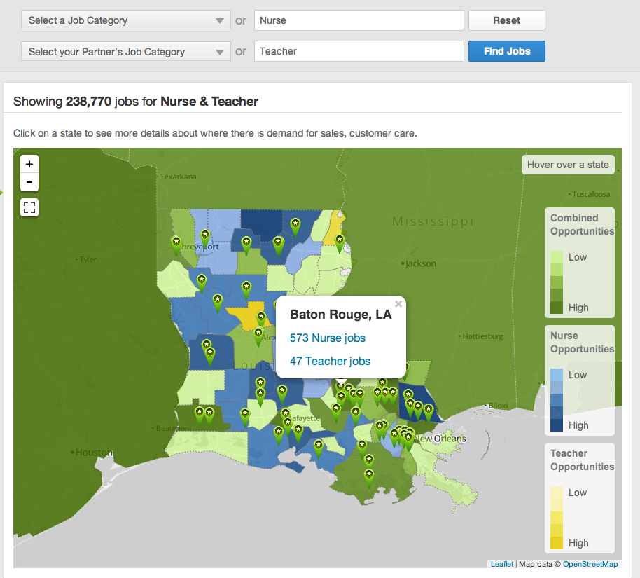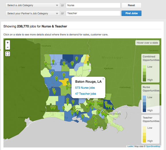 Job Explorer suggests those jobs, along with statistics on how many users have actually made the job switch, and the average annual salary for those suggested jobs. Job seekers can then use the map to see where alternate jobs for themselves and their partners are most in demand, opening up more options and increasing the likelihood of finding work.