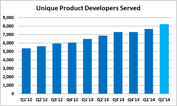 Tracking the number of unique product developers that Proto Labs serves can provide insight into whether or not Proto Labs' rapid manufacturing services are becoming more popular in the product development world. In the second quarter, Proto Labs served a record 8,222 unique product developers, which doesn't account for product developers served from its Fineline 3-D printing services. In other words, Proto Labs' rapid manufacturing services are clearly becoming more essential to product developers worldwide -- an encouraging sign for the company's long-term prospects.