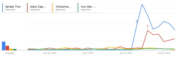 So why is Marvel making so much noise about a female Thor and a black Captain America? It's simple -- a female Thor and black Captain America generate more mainstream interest in comics than comic-specific events, like Wolverine's "death" and Iron Man's new armor, as seen in this Google Trends comparison: