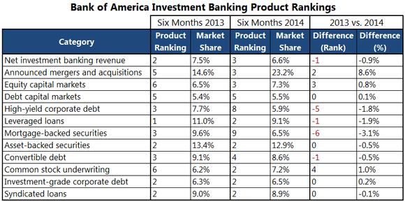 While its net share of the revenue is down slightly, that it has seen such an impressive gain in such a growing category is a reason for optimism. And knowing that Bank of America's total investment banking fees have risen 5% year over year suggests even the slight drops aren't an overall cause of concern.