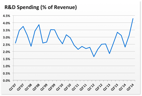 R&D spending has also spiked over the past two quarters as a percentage of sales. Last quarter, Apple spent 4.3% of revenue on R&D, the highest level in more than seven years.