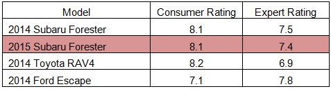 Also, 2015 Forester's ratings by Kelley Blue Book are not far off from its immediate contenders Ford's Escape and Toyota's RAV4. Surprisingly, it has already overtaken the 2014 Toyota RAV4 and is only slightly behind the 2014 Ford Escape. In terms of consumer ratings, the Forester is trailing only a bit behind the RAV4, but has surpassed Ford's Escape dramatically.