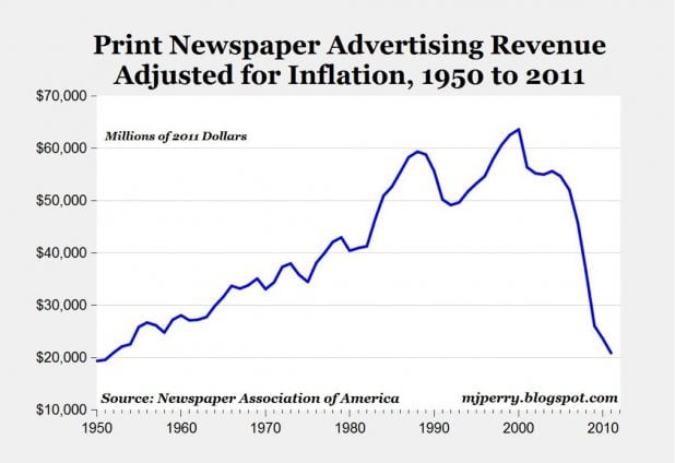 Since its invention, people predicted the Internet would completely change the print newspaper industry. Yet up until the 2000s, advertisement revenues increased.