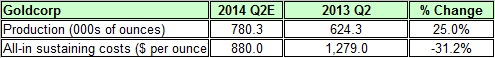 Based on the company's 2014 guidance, it expects to produce 3.025 million ounces of gold during 2014. Considering its production quota in the first quarter, Goldcorp is likely to present production volume of 780,000 ounces of gold in the second quarter -- nearly 25% higher than the parallel quarter last year. The table below summarizes Goldcorp's key metrics in the second quarter of 2013 and 2014.