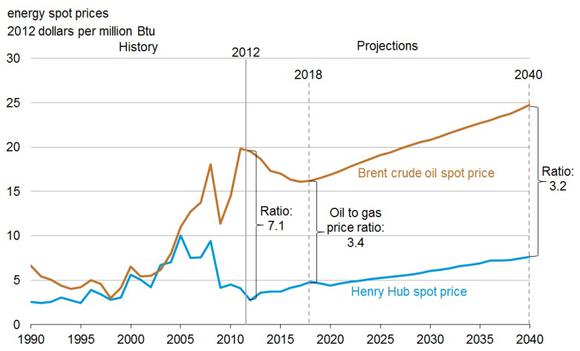 However, this ratio is based on current and expected U.S.-based pricing. The same EIA report also states that U.S. natural gas exports are expected to increase by nearly four times during the same period, along with a nearly 30% reduction in U.S. imports of natural gas. Taken together, this will create significant demand, even on abundant U.S. supplies of natural gas. More importantly, the U.S.-based price of natural gas is likely to be heavily influenced by, and closely approach, the global price of natural gas. The EIA report admits to this: