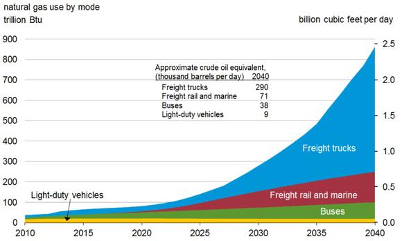 The U.S. Energy Information Administration (EIA) administrator, in his March report to the Committee on Energy and Natural Resources of the U.S. Senate, stated that EIA analysis shows that during the next 25 years, natural gas will grow dramatically in use by freight trucking and other commercial transportation modes.