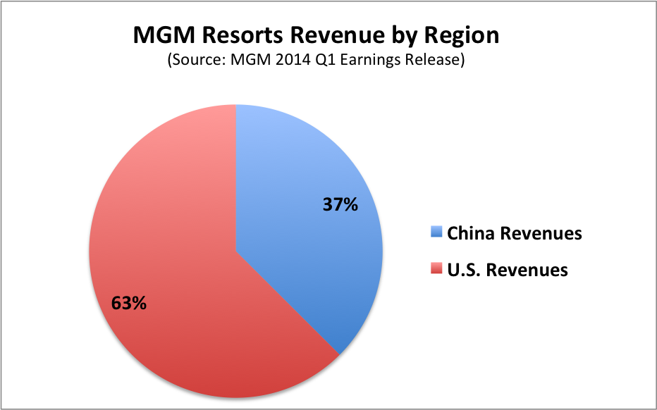 Las Vegas Sands has been able to post huge results because of its diversified revenue growth in Asia, particularly from Macau but also from its Singapore operations. Wynn, which gets 75% of its revenue from Macau, is much the same. However, MGM Resorts only gets 37% of its revenue from Macau, with the majority of its global revenue still coming from Las Vegas at about 50%, and it also gets additional revenue from the U.S.