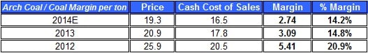 The drop in coal sales is not only due to lower output, but also to falling coal prices. Arch Coal, as an example, estimates its margin on coal sold per ton will decline from 14.8% in 2013 to 14.2% in 2014. This is after the margin was over 20% back in 2012. Moreover, even after the company expects its cash cost to fall by 7% in 2014, year over year, this decline won't be enough to offset the average annual realized price of coal.