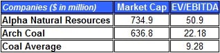 Let's start with these companies' current valuations. Based on their enterprise value to EBITDA ratios, these companies are priced high even in the coal industry. The table below summarizes these figures.