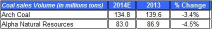 The other factor to consider is their lack of production growth. This year, Arch Coal's production is expected to fall by 3.4%, and Alpha Natural Resources' by 4.5%.