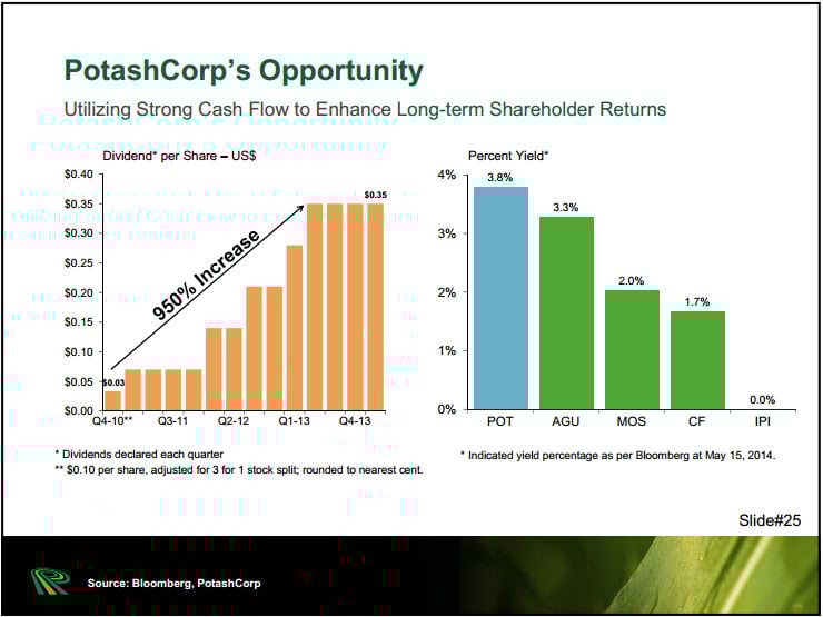 PotashCorp's dividend surged an astounding 950% since the fourth quarter of 2010. Its current yield is above both Agrium's and Mosaic's as the following slide points out.