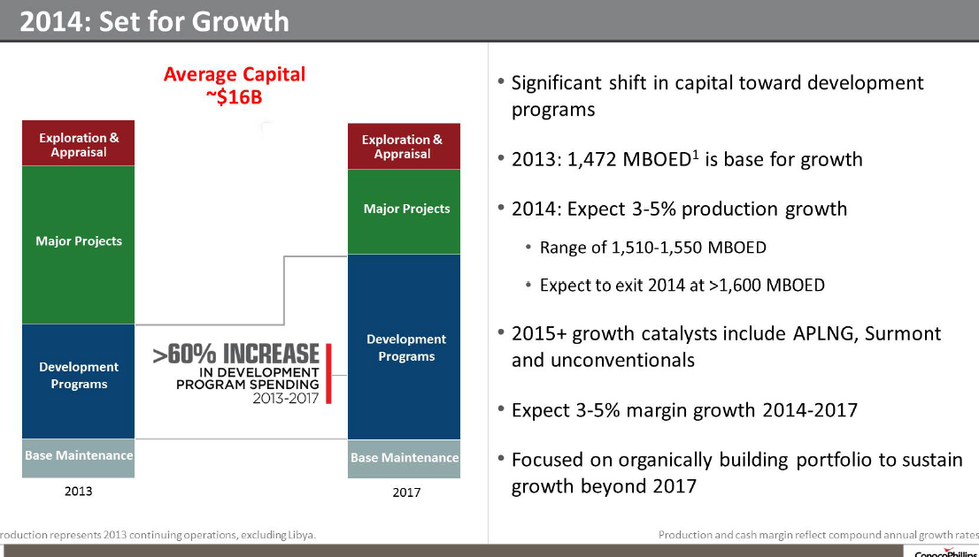 Apart from spending for North American oil, Conoco will be pushing hard for the completion of the Australia Pacific LNG program, as well as the Surmont oil sands project in Canada. Both these projects are expected to come online by mid-2015, thereby substantially lifting average production volumes.