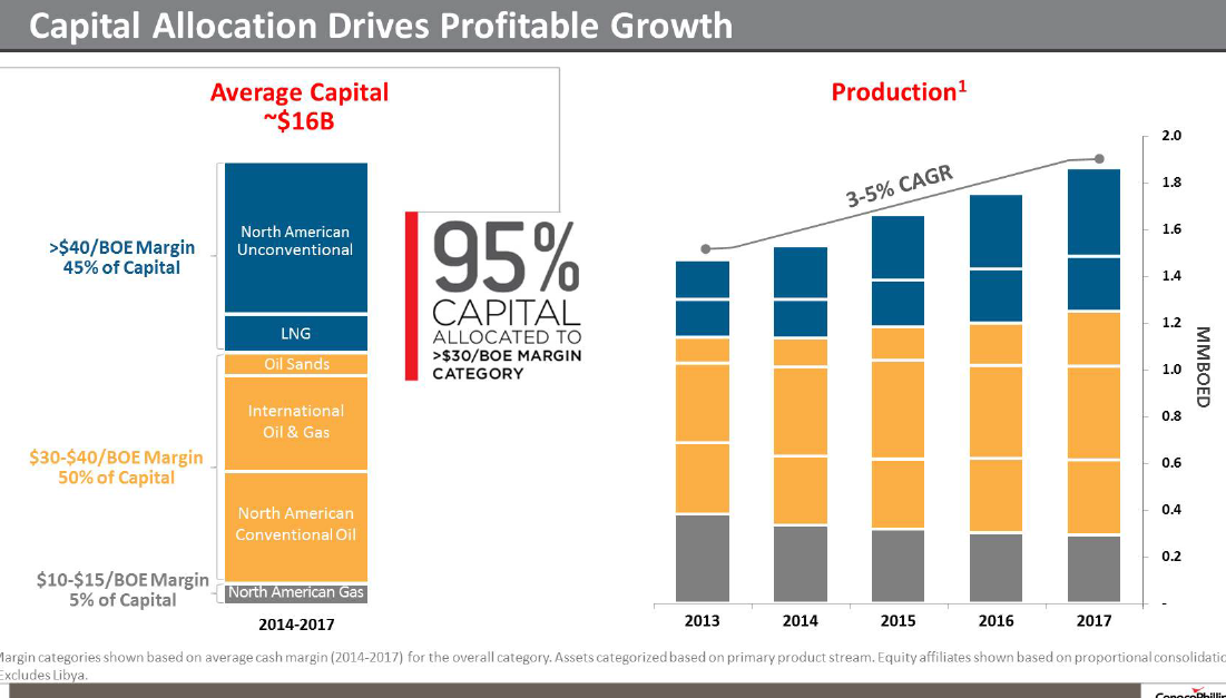 Conoco should be reporting healthy growth in production from the North American unconventional segment, for the simple reason that this segment is slated to carry a cash margin of over $40 per BOE, the highest across the company's diverse asset portfolio. Management expects a 22% annual production growth rate till 2017.