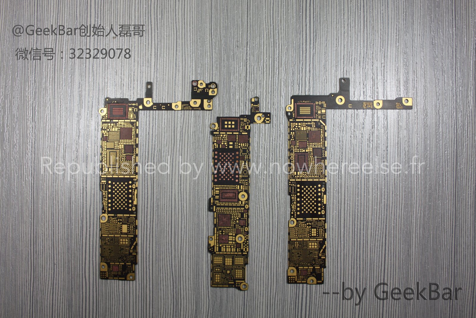 Alleged iPhone 6 logic boards (left and right) next to an iPhone 5s logic board (center). Image source: Nowhereelse.fr.