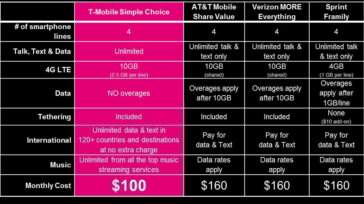 AT&T's "Best-Ever Pricing" four lines for $160 vs four lines for $100 with T-Mobile -- with unlimited talk, text, and data plus up to 10 GB of LTE data on our data-strong network. Plus, their "Best-Ever" deal comes with a boatload of crap -- domestic overages, international roaming fees, hidden device subsidy costs, and on and on.