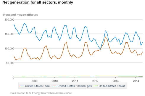 As installations have grown, so has the amount of power coming from solar power plants. According to the Energy Information Administration, utility solar power hitting the grid will soon pass 2,000 MW-hrs per month, or enough to power over 67,000 homes, and is growing rapidly from there.